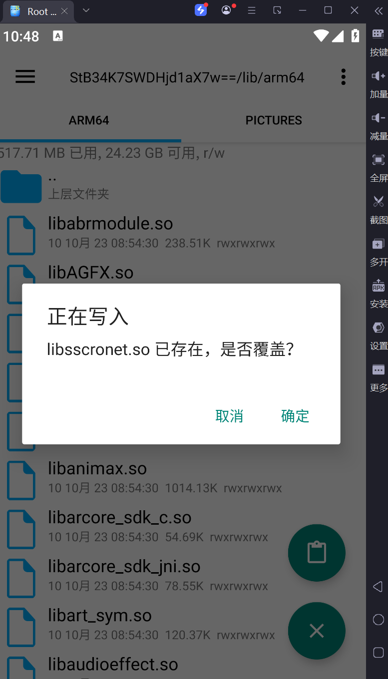 在覆盖文件前,需要将X音的lib/arm64的权限修改为用户可写