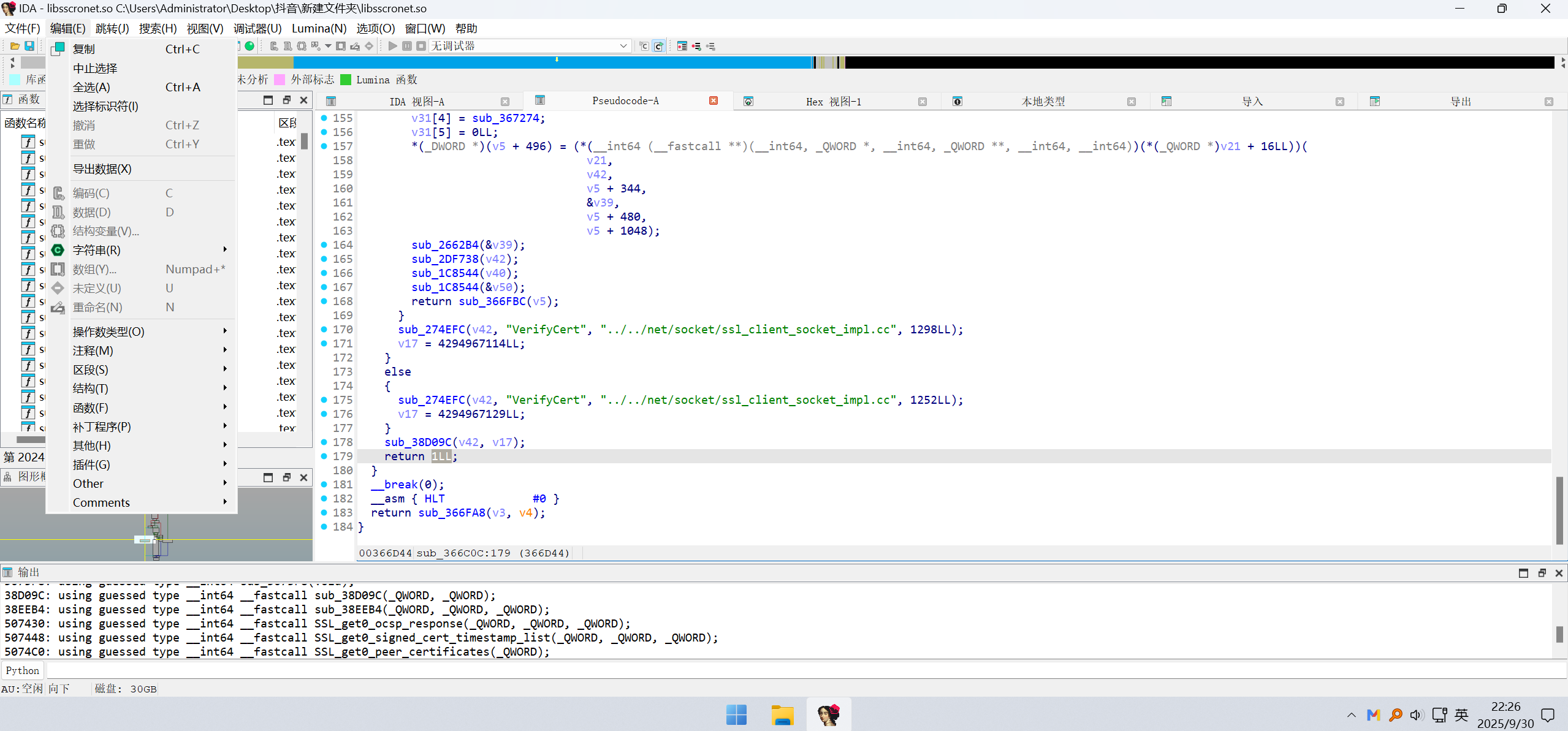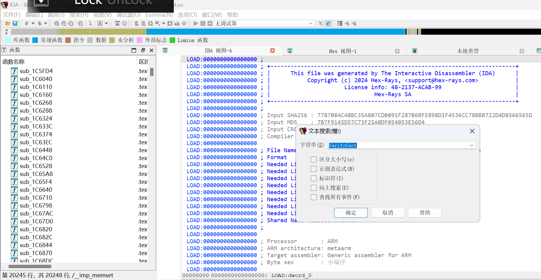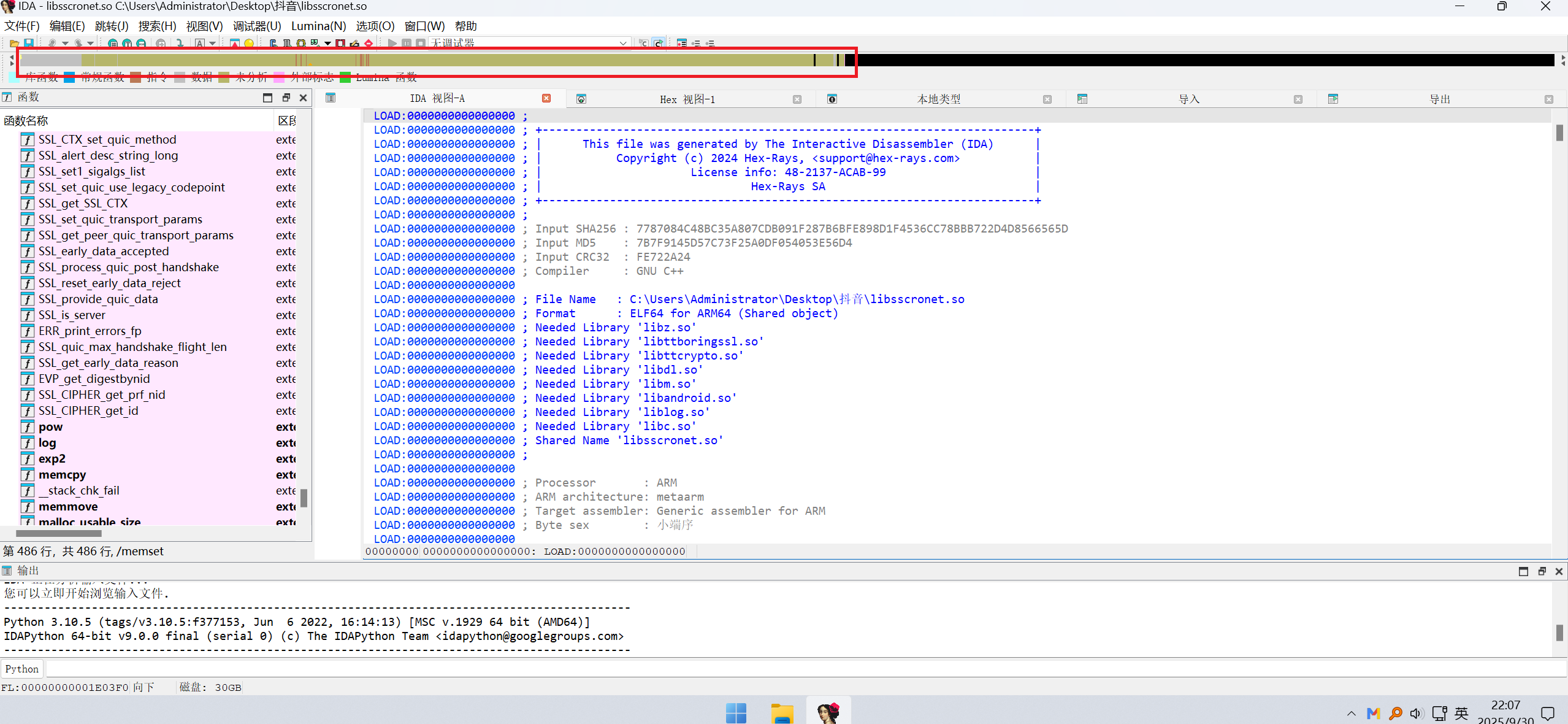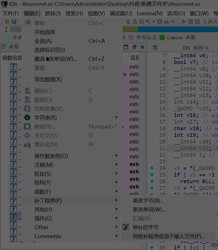 把这个软件提取出来,使用IDA Pro(反编译工具) 对libsscronet.so软件进行反编译